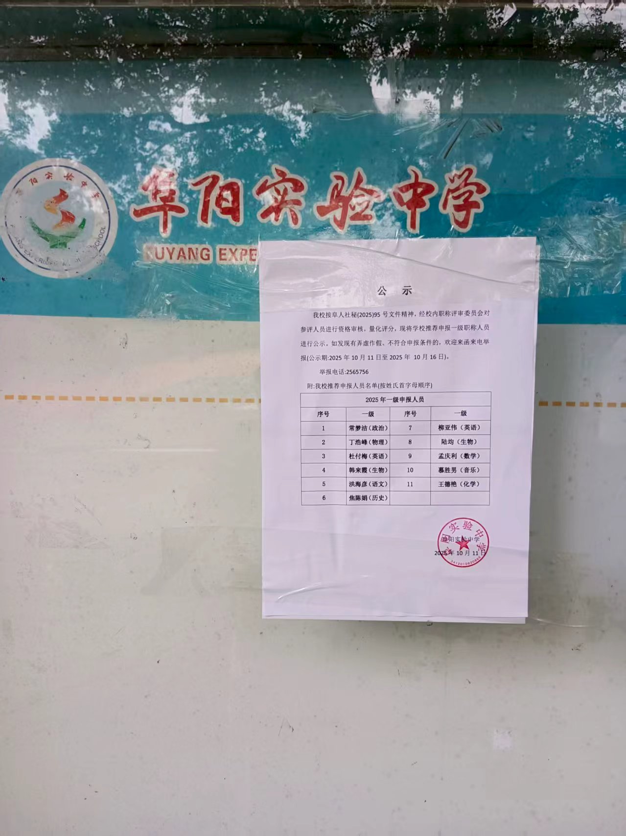 阜阳阜合实验中学于常海(初中体育与健康)申请一级教师任职资格申请材料目录