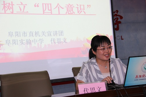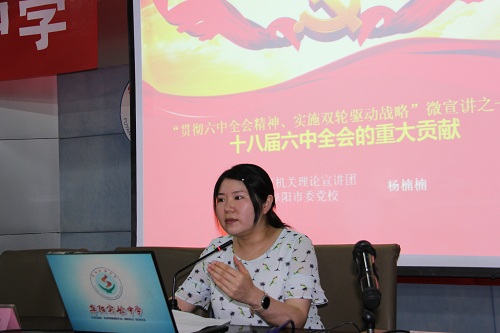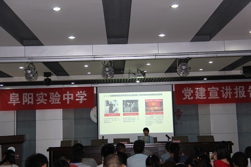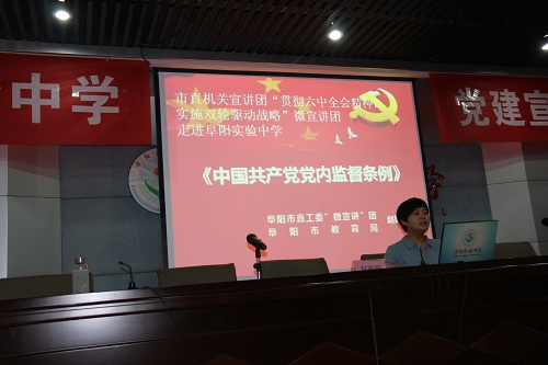 为了进一步提高广大党员教师的思想认识,了解党建工作的内容和要求以及全市发展的重要举措,在市教育局机关党委的协调安排下,6月26日,市直机关宣讲团在阜阳实验中学举行了“贯彻六中全会精神,实施双轮驱动战略”微宣讲活动,150余名党员和教师聆听了讲座。