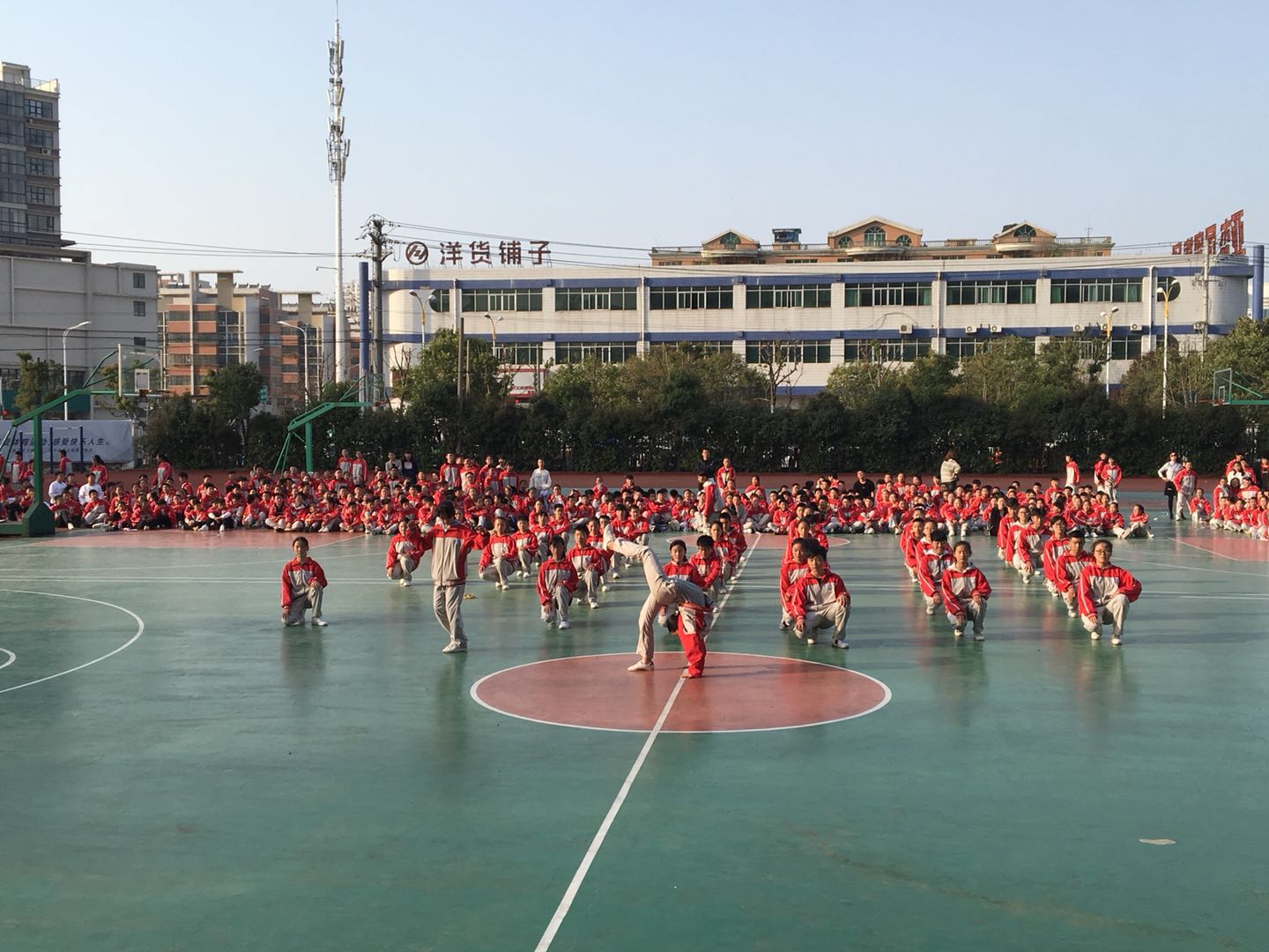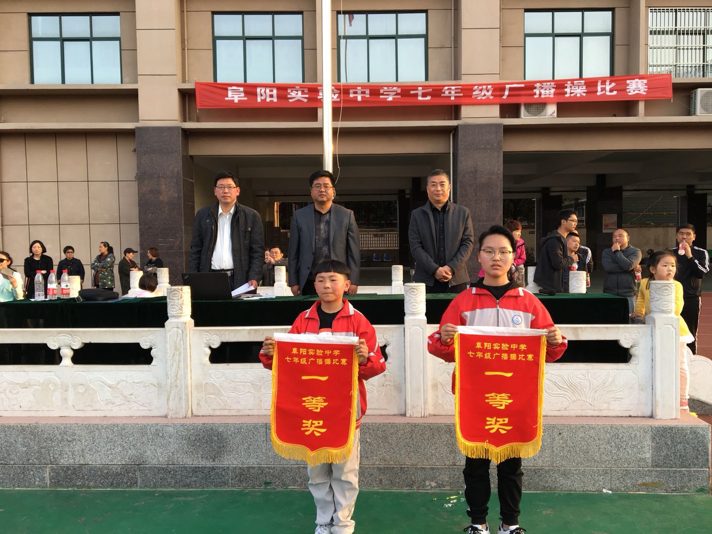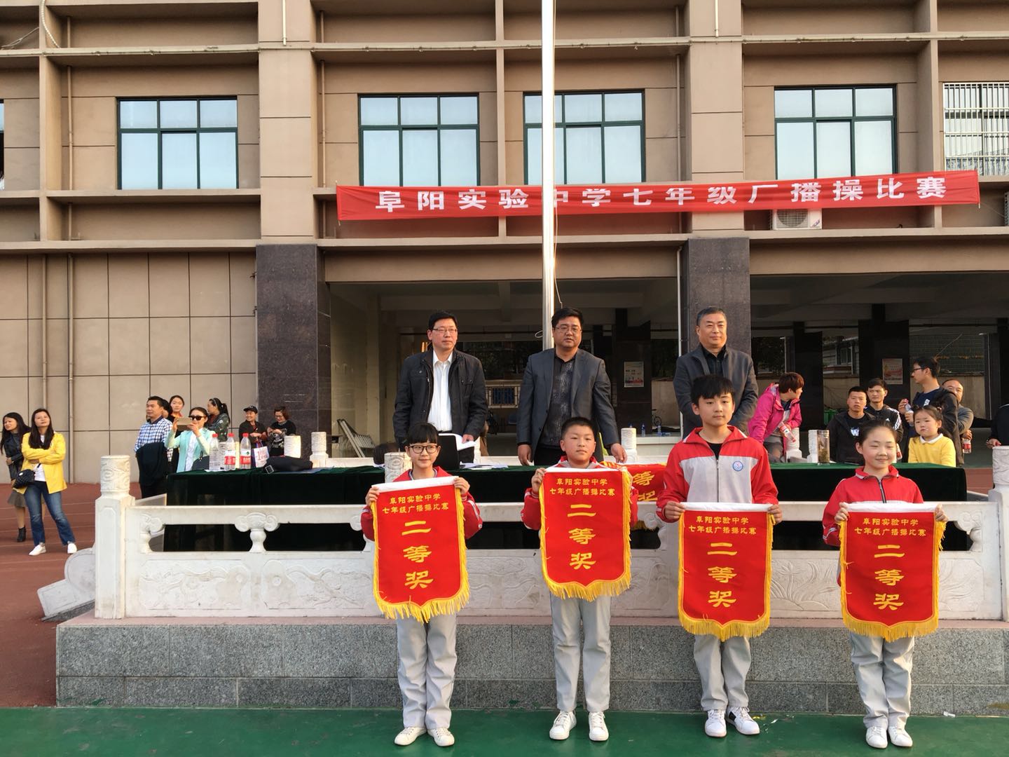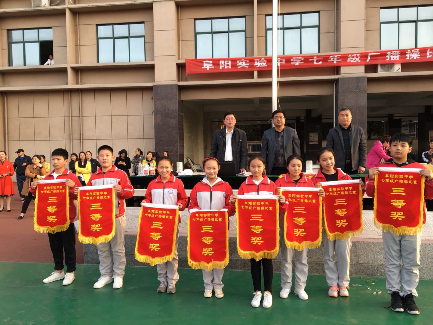 为进一步增强学生体质、磨练意志,培养集体主义荣誉感和团队合作精神。3月27日下午,迎着温暖的春风,伴着和煦的阳光,实验中学七年级的14个班级,在校风雨操场举行了广播体操比赛。校长王永庆、副校长王永红、教务处主任赵刚、政教处主任宋磊等领导出席了本次活动。