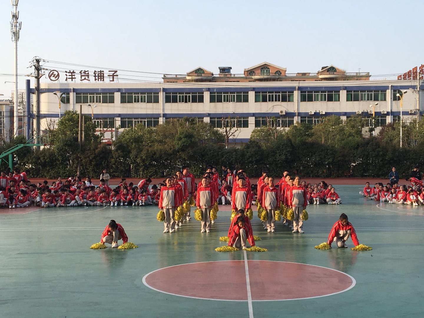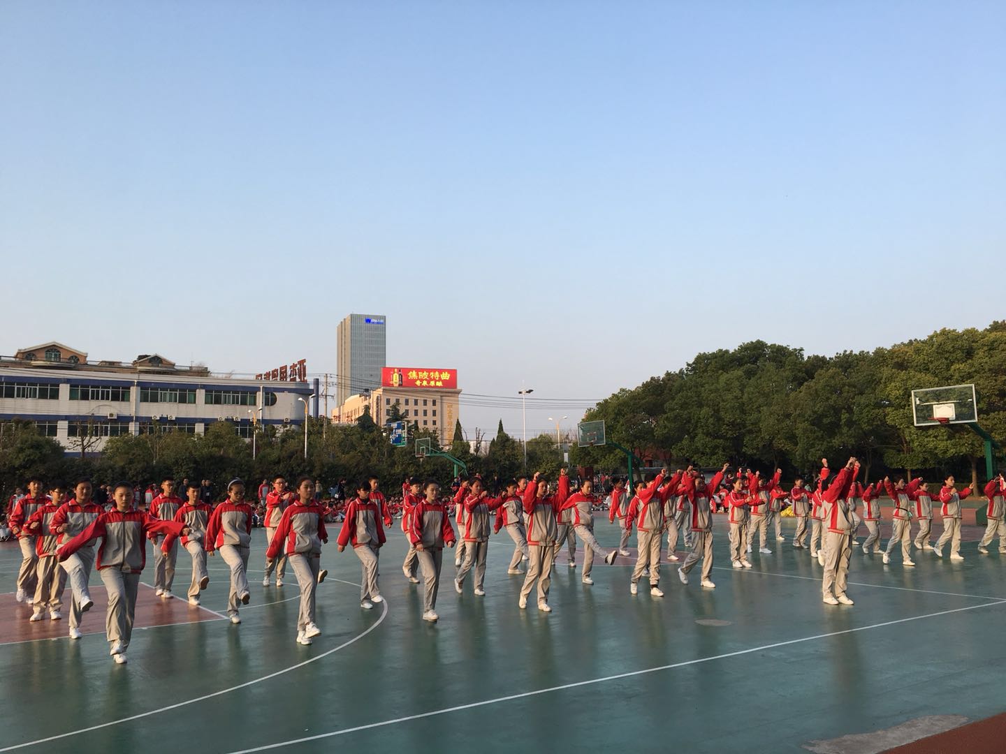 各班根据比赛方案要求,利用体育课或课余时间组织学生加强训练,掀起了广播操、训练队列的高潮。在政教处、体育组精心统筹和组织安排下,整个比赛组织有序。