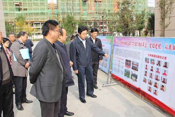 王永庆校长向谢副省长一行简要汇报了南校区的基本情况,随后,大家饶有兴致地参观了南校区校容校貌和教育教学设施。视察过程中,谢副省长深入了解了学校的办学机制、管理体制、教师待遇等情况,对市委市政府和阜合产业园管委会、市教育局大力支持实验中学南校区建设和发展予以充分肯定,并指出要进一步解放思想,不断探索实践,深化改革。在八(3)班教室,王永庆校长向来宾们演示了手机“云课堂”远程视频应用,谢副省长指出要充分发挥现代信息技术在教育中的应用。在“艺术选课走班”、“爱班爱校,从我做起”主题活动等展板前,谢副省长驻足仔细观看,并对周围的同志表示,这样的活动很好,一定要抓好素质教育,力戒“死读书、读死书”。