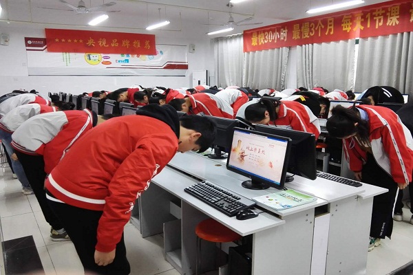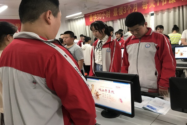 学生在网络计算机教室登录阜阳文明网开设的“网上祭英烈”网页,在网上向先烈鞠躬献花,进行网上祭奠、发表祭奠感言和开展网络访谈活动。