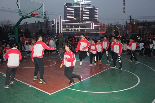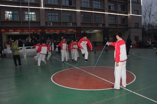 首先进行的是花样单绳比赛,随着激情澎湃的乐曲,选手们使出浑身解数,踏步跳、双飞跳、交叉跳、倒摇跳……一个个动作令人眼花缭乱,也引得观众们阵阵喝彩。有的班级还精心设计了巧妙的进退场和队形变换,更给人以深刻的印象。接着,又进行跳长绳比赛,和上一轮展示技巧不同,这一轮比的是速度和连贯性。各代表队派出10名选手,从翻飞的长绳间灵巧地跃过。尽管已是傍晚时分,沉沉的暮色却挡不住大家的热情,场上场下一片欢腾,寒冷和疲惫也一扫而空。