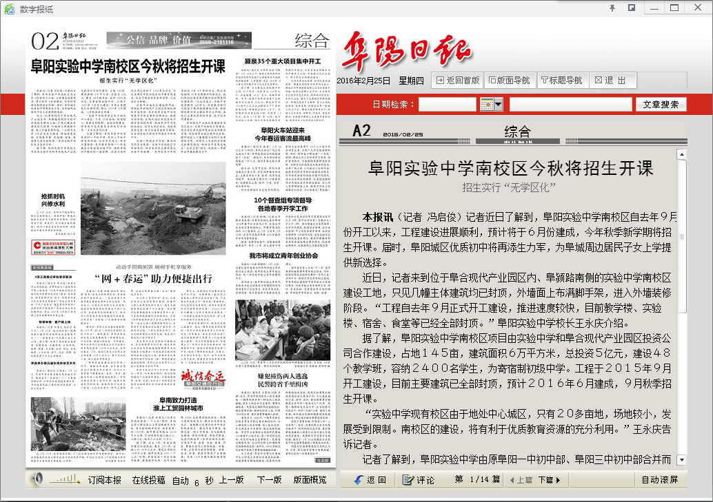 阜阳实验中学南校区今秋将招生开课(原文刊登于2016年2月25日阜阳日报A2版)