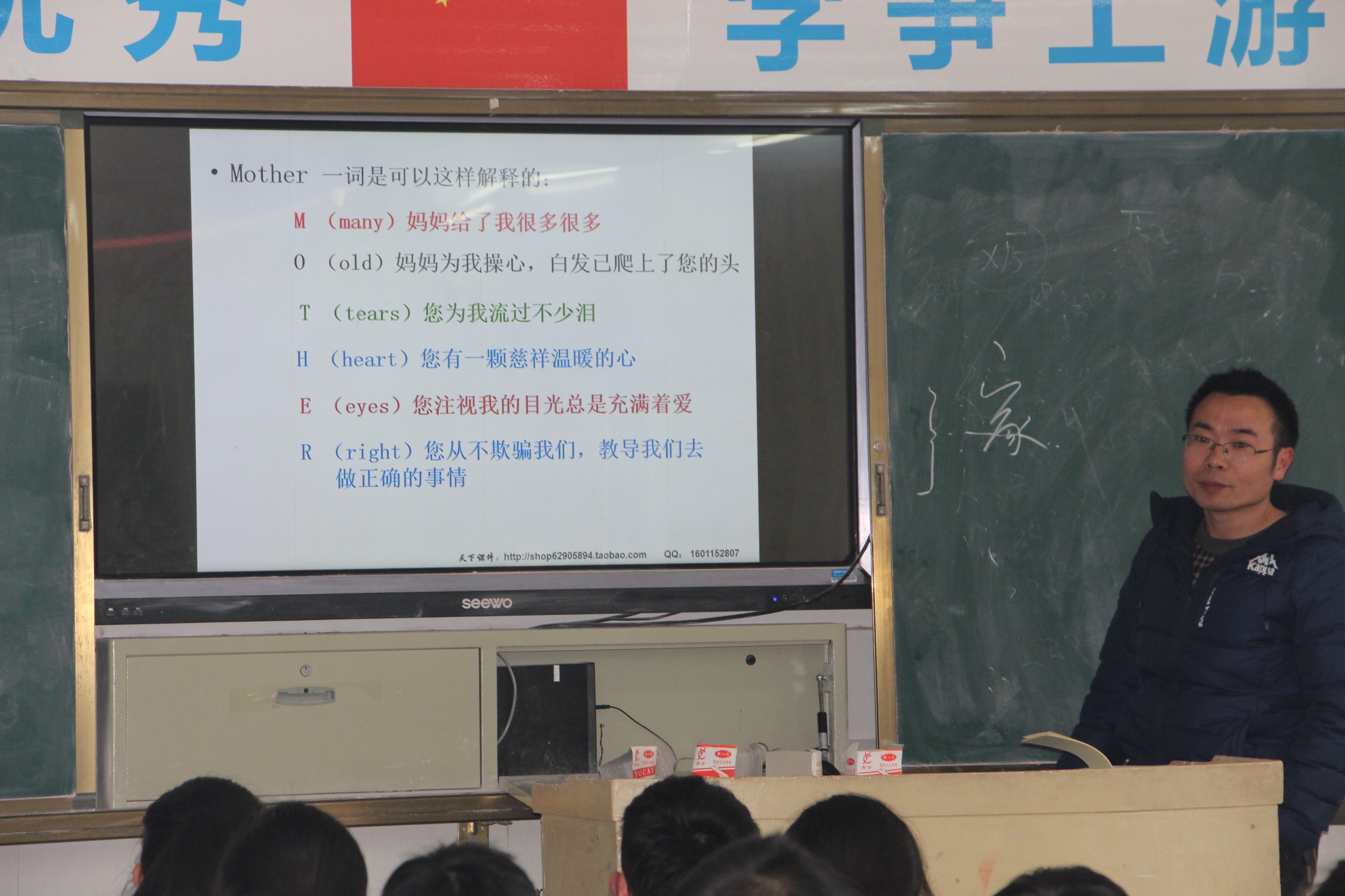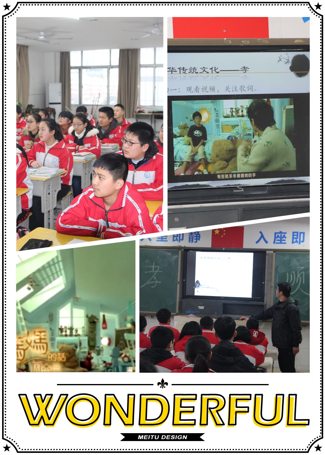 本次班会包含“感受”和“行动”两部分,班会伴随着一首周杰伦的《听妈妈的话》歌声正式开始,每位学生都在轻声哼唱…