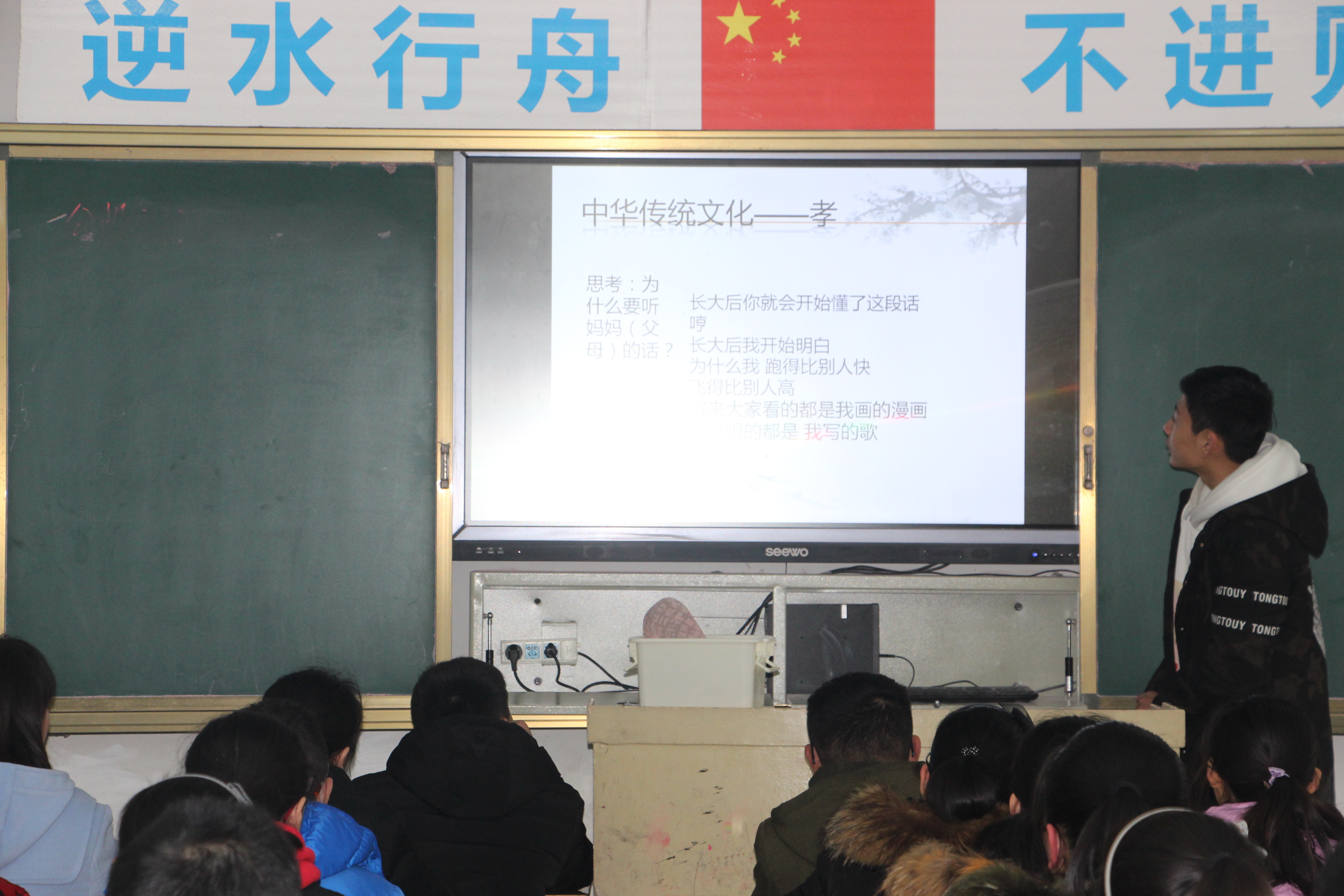 3月20日下午,八年级的班主任带领学生展开了一节“传承经典文化,弘扬爱国情怀”主题班会活动。