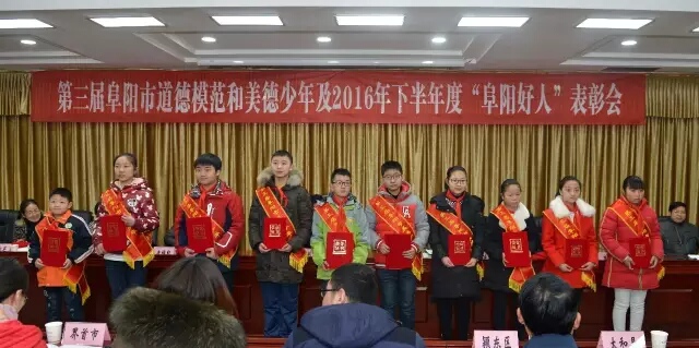 2月23日,市委市政府隆重举行第三届阜阳市道德模范和美德少年及2016年下半年度“阜阳好人”表彰会,我校九(1)班学生刘姝彤、八(4)班学生卞嘉诚出席大会并受到市委市领导的亲切接见和表彰。