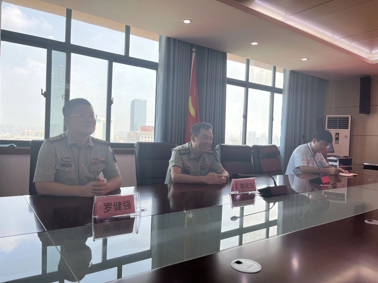 阜阳实验中学副校长韩学敏,德育与宣传中心主任宋磊、政教处主任朱仁武等与陈兆国政委一行亲切座谈。