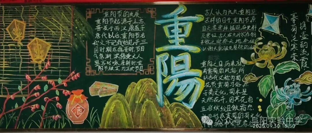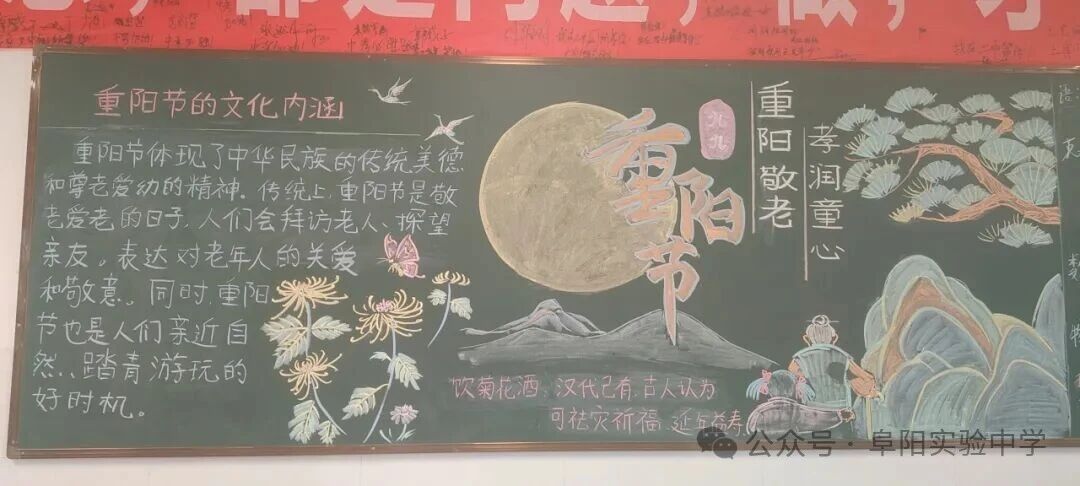 同学们热情高涨,充分利用课余时间,围绕重阳节的历史渊源、文化习俗、经典诗词以及尊老敬老的现实意义,进行了精心的构思与设计,一方方黑板,在同学们的巧手下,变成了一扇扇传播传统文化的窗口。