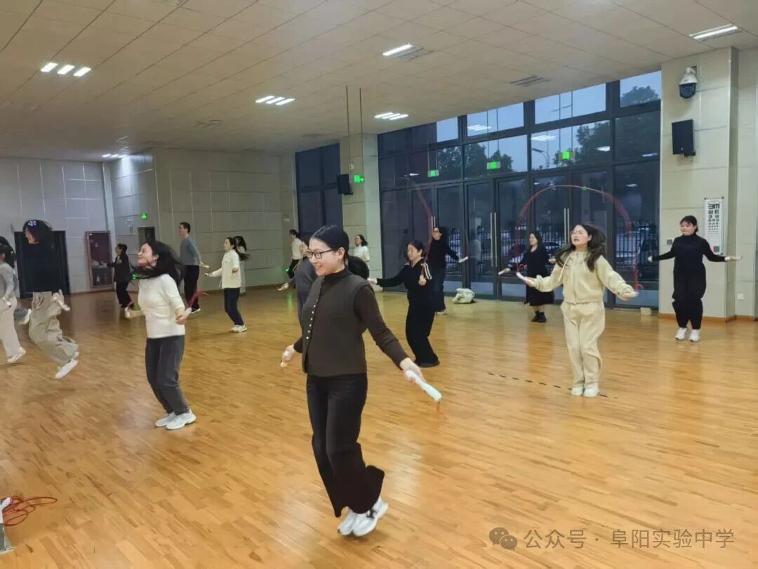 与此同时,集体项目“1分钟跳绳比赛” 在一楼赛场紧张上演。比赛以年级为单位,每个年级派出25名教职工,男女组合,协同作战。一根根跳绳在老师们手中飞快旋转,他们身姿轻盈,配合默契,充分展现了各年级团队强大的凝聚力和奋勇争先的精神风貌。经过激烈的角逐,最终七年级组、八年级组和九年级组凭借出色的发挥,分获该项目的一、二、三等奖。