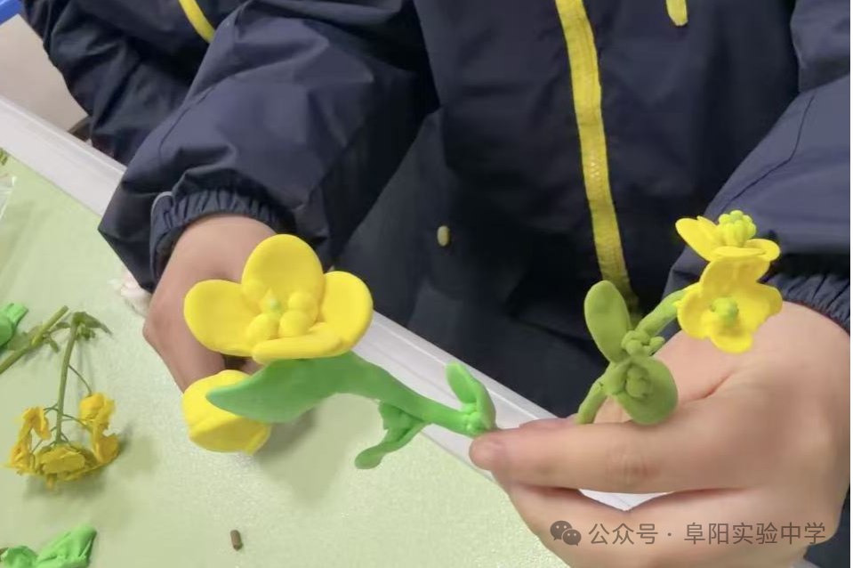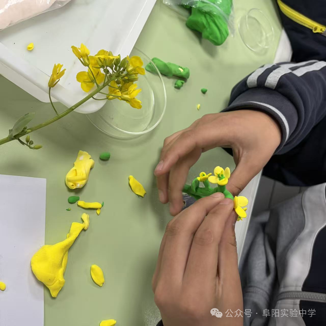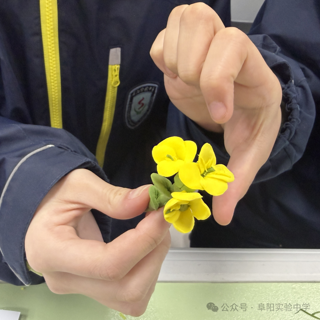 为进一步深化记忆、激发创意,实验室里还开展了油菜花黏土模型制作活动。同学们充分发挥动手能力,用绿色、嫩黄、白色等彩色黏土,分别捏制花萼、花瓣、雄蕊与雌蕊,精心拼接、细致修整。一个个层次分明、细节逼真的油菜花模型在同学们手中诞生,部分同学还搭配黏土茎秆,还原了油菜花在菜园中的生长模样。此次模型制作,不仅巩固了生物知识,更培养了同学们的创新思维与动手实践能力。