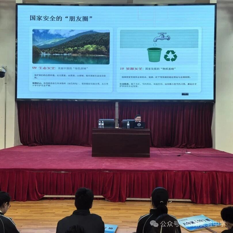 本次报告会特邀阜阳市中级人民法院审判管理办公室主任、阜阳实验中学法治副校长马杰进校园开展专题讲座。马主任紧扣中学生年龄特点与认知规律,以《中华人民共和国国家安全法》为核心,用通俗语言、真实案例,全方位解读国家安全的重要意义与青少年维护国家安全的具体路径。