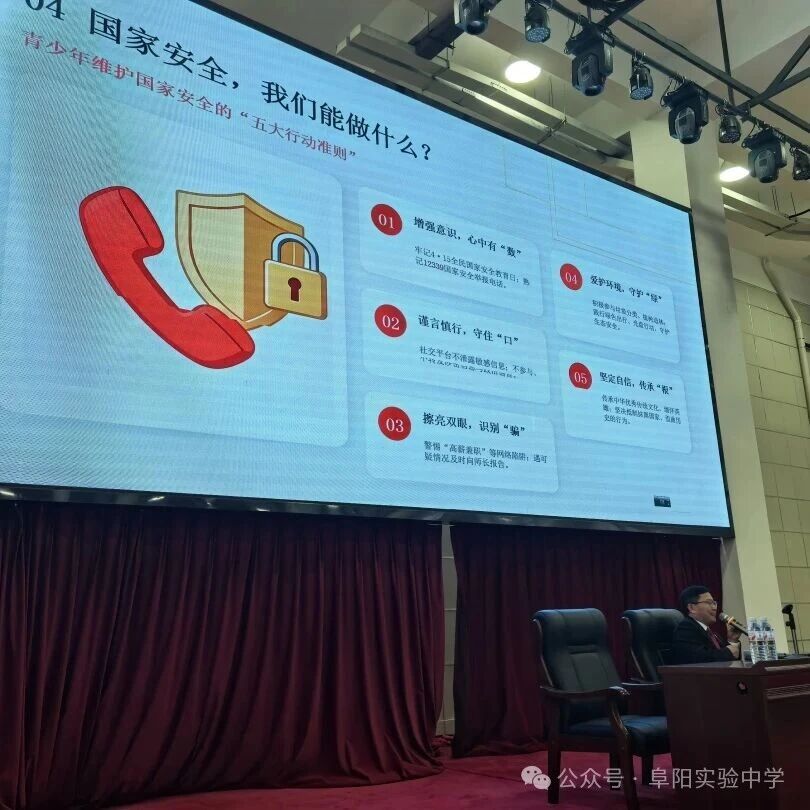 此次法治报告会的圆满举行,有效提升了青少年的国家安全素养与法治观念,让“国家安全、人人有责、人人可为”的理念深入人心。国家安全无小事,青年担当正当时。阜阳实验中学将持续把法治教育融入日常,推动全校师生携手并肩,以青春之力筑牢国家安全防线!